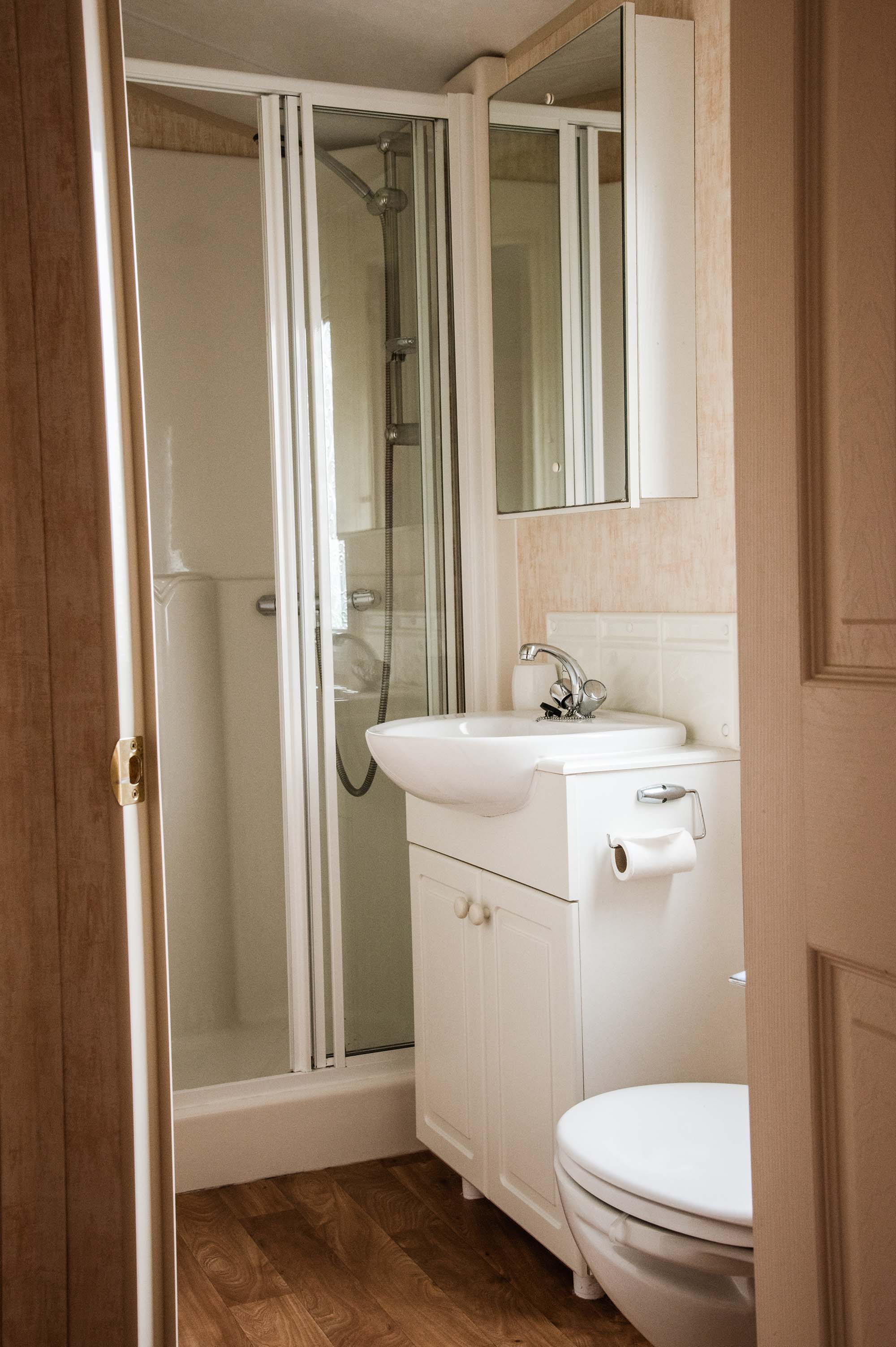 This well-equipped caravan features a cozy double bedroom with an en-suite bathroom, a restful twin bedroom, and a fold-out double bed in the main lounge area for extra sleeping space.